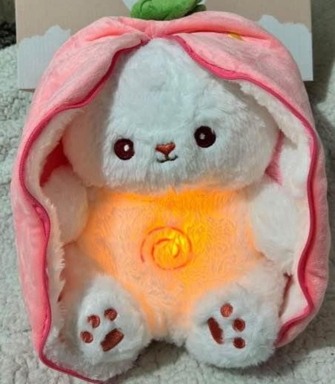 El peluche conejo y zanahoria respira contigo a la vez, ponte cerca y siente su